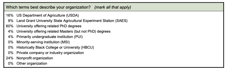 Most respondents (76%) reported a professional focus on plants, including major plant crops (20%), horticultural specialty crops (16%), and plants grown for other purposes besides human consumption (12%; Table 3). Animals were a primary focus for 12% of respondents. Pests, diseases, physiological stressors, and other threats were a focus for 20% of the respondents; 24% reported working on understanding wild organisms not directly used in agriculture.